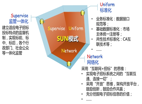 國家招標投標公共服務平臺核心建設思路:通過“SUN”模式,在全國范圍內(nèi)推動建立起由交易平臺、公共服務平臺、行政監(jiān)督平臺構成,分類清晰、功能互補、互聯(lián)互通的電子招標投標系統(tǒng),從而促進‘公開、公平、公正、誠實信用’的市場環(huán)境。