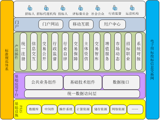 - 基礎設施:由云計算構建了國家招標投標公共服務平臺的基礎設施,主要提供從網(wǎng)絡、儲存、計算資源、安全、操作系統(tǒng)、中間件、數(shù)據(jù)庫等PAAS層服務;